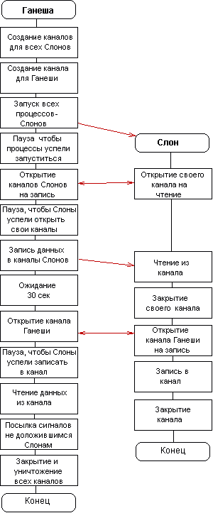 Строго говоря, для синхронизации деятельности процессов следовало бы использовать специальные средства, но чтобы избежать усложнения примера, мы попытались обойтись без них и построить алгоритмы функционирования процессов таким образом, чтобы предупредить или, по крайней мере,свести к минимуму вероятность возникновения нежелательных эффектов. Укрупненная схема этого алгоритма показана на рисунке ниже. Красными стрелками показаны моменты выполнения, в которые происходит принудительная синхронизация процессов - за счет возможных ожиданий при выполнении операций над каналами.