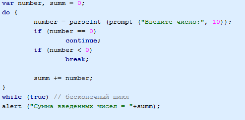 Рассмотрим простой пример: скрипт запрашивает у пользователя числа при помощи метода "prompt" и суммирует их. Если число = 0, текущая итерация прерывается и повторяем шаг 1. Если число отрицательное, вычисления завершаются.